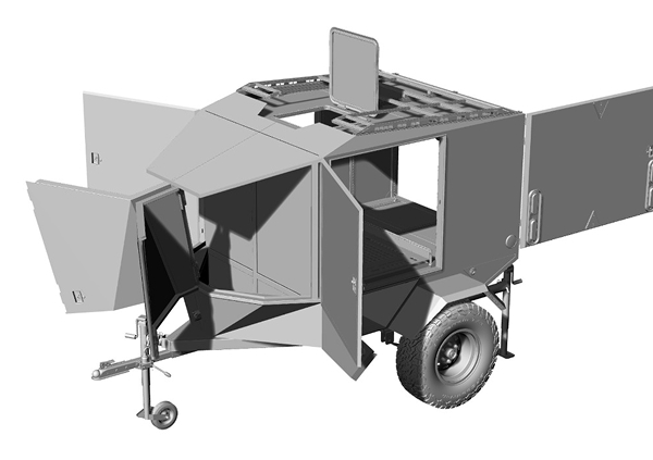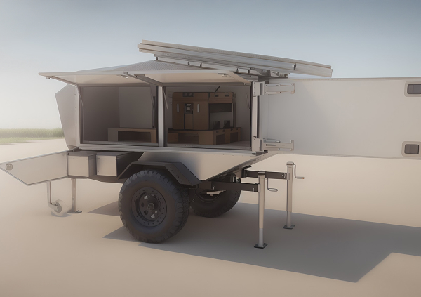 El GEMS es una estructura tipo remolque todoterreno (off-road) equipado con un sistema híbrido solar-eólico, combinando paneles solares desplegables y una miniturbina eólica.